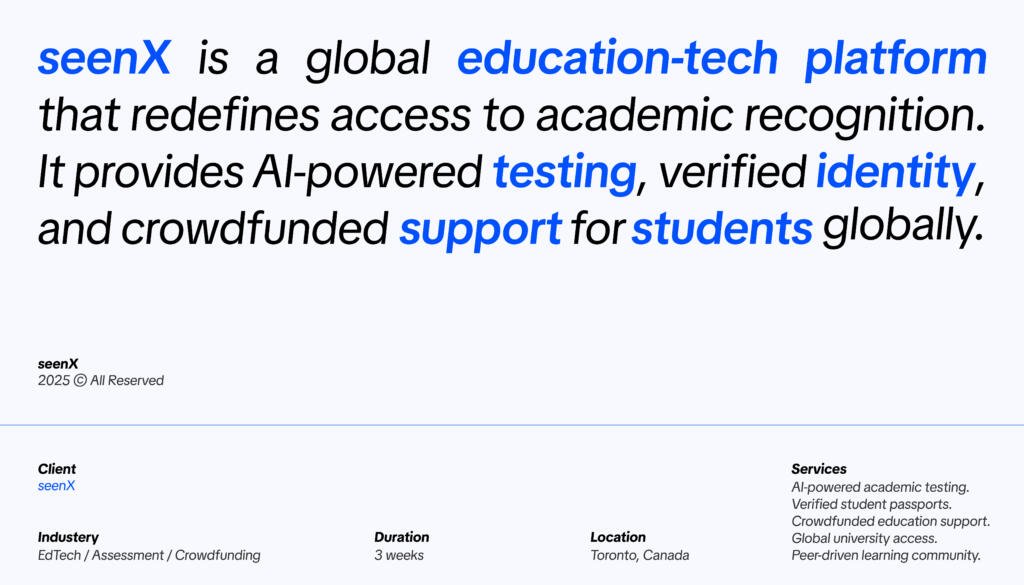 Test. Verify. Fund.seenX is a global education-tech platform that redefines access to academic recognition. It provides AI-powered testing, verified identity, and crowdfunded support for students globaly. ClientseenXYear2025CreatorSuhail YadgariShareLinkedinShare-emailCopy URL to clipboard